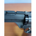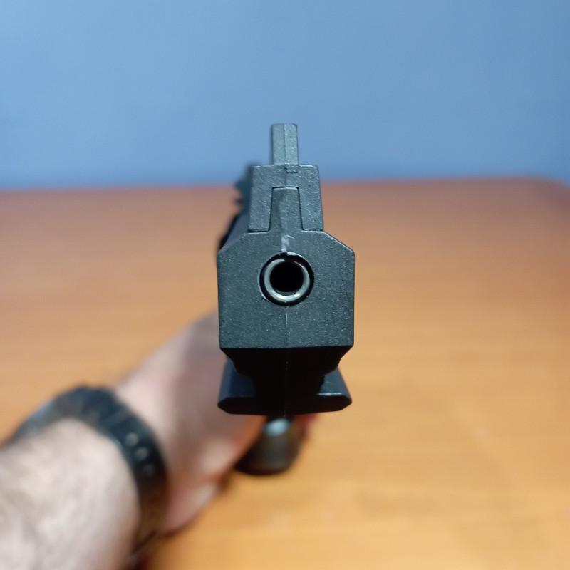 "Vista delantera del cañón del Crosman Vigilante ,se puede ver el carril inferior del cañón para colocar una linterna táctica o puntero láser, visto así no parece muy realista el revólver."