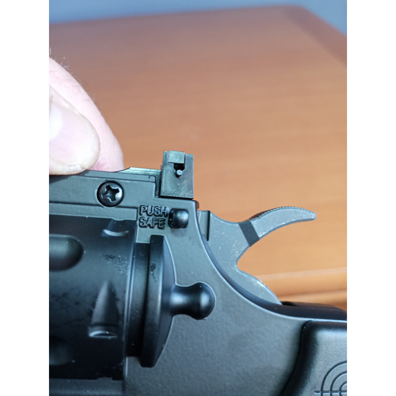 "Vista del seguro del Crosman Vigilante en posición de disparo, seguro de muy fácil manejo tan solo hay que presionar según convenga. "