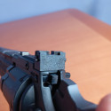 "Vista frontal del alza del Crosman Vigilante CO2, lo dicho anteriormente fabricada en polímero , buena visibilidad a la hora de apuntar. También se puede ver un pequeño fallo en el acabado , pasando una escofina listo."