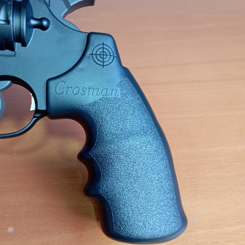 "Vista del lado derecho de la empuñadura de Crosman Vigilante CO2, se puede ver el grip de la caja y el logotipo de la marca , buena ergonomía en la mano no se resbala."