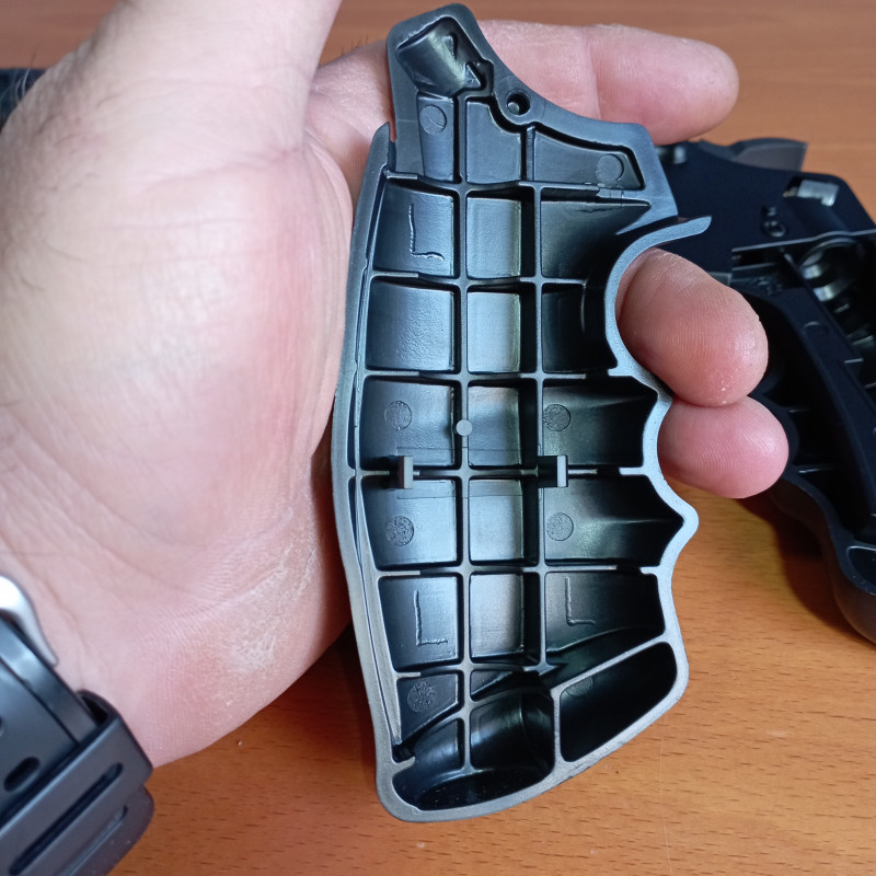 "Vista interior de la cacha izquierda de la empuñadura del revólver Crosman Vigilante CO2 4'5mm plomo ,se puede ver que está fabricada en polímero de buena calidad, tiene muchos nervios que le dan robustez."