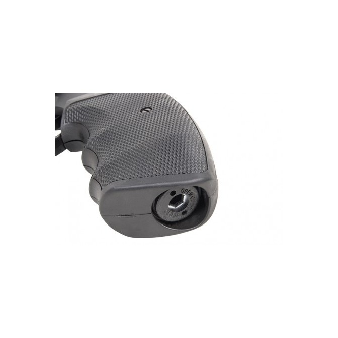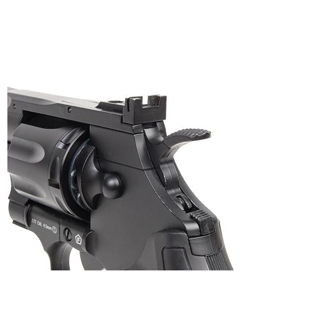 La principal característica de este revólver es que tiene un cañón de acero estriado de 4", lo que permite aumentar la precisión de los balines de plomo. Además, dispone de un cuerpo Full Metal para que resista el arma a largas sesiones de tiro. Dispone de un seguro manual en la parte trasera del revólver.