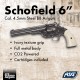 El Schofield 6" tiene una potencia de tiro de 2,9 Julios, ideal para tiro deportivo como Plinking o Action Shooting. En la empuñadura permite incorporar una bombona de Co2 de 12 gramos, otorgándole una velocidad de salida de 128 m/s. Tiene un seguro manual para aumentar la seguridad del tirador.