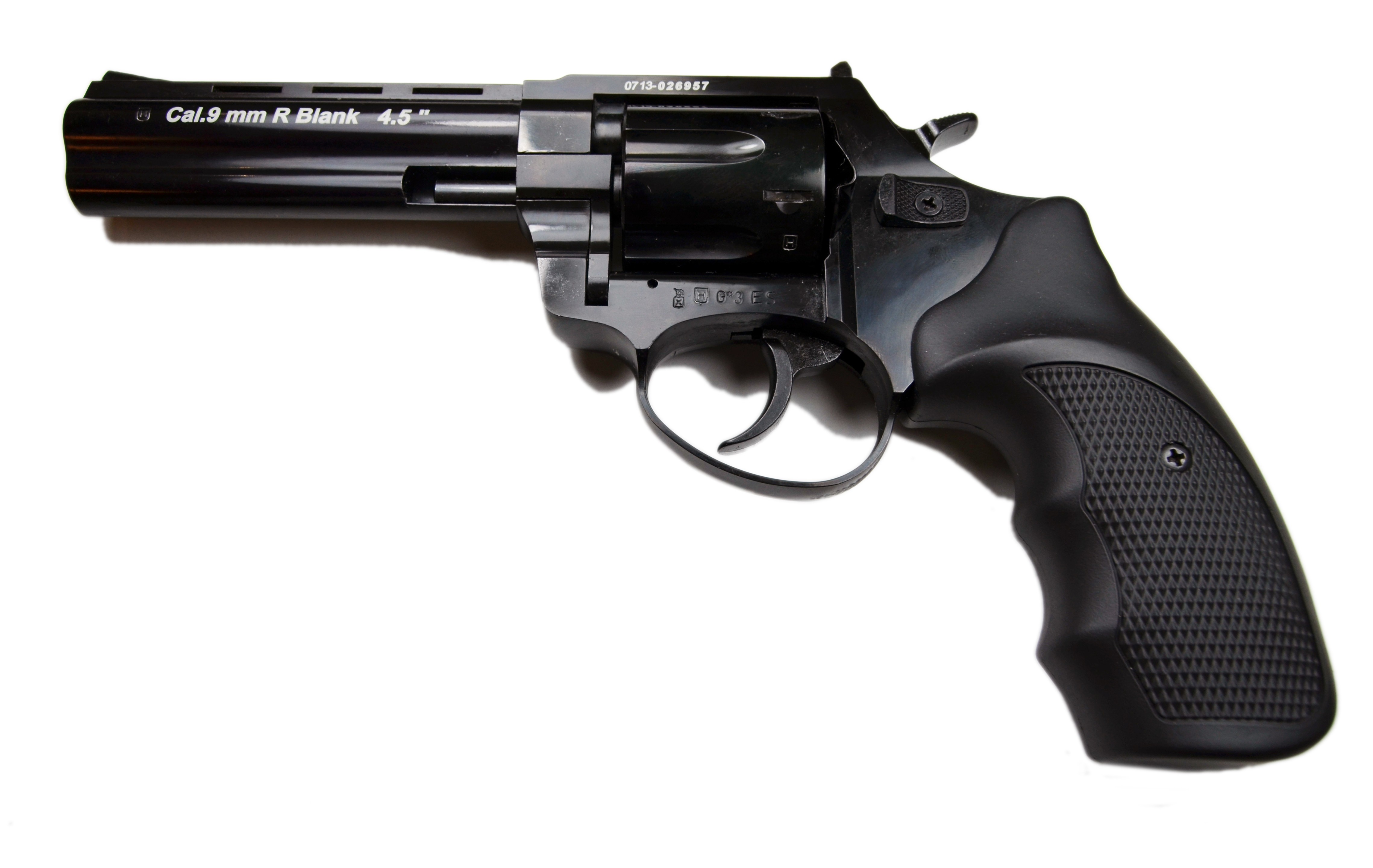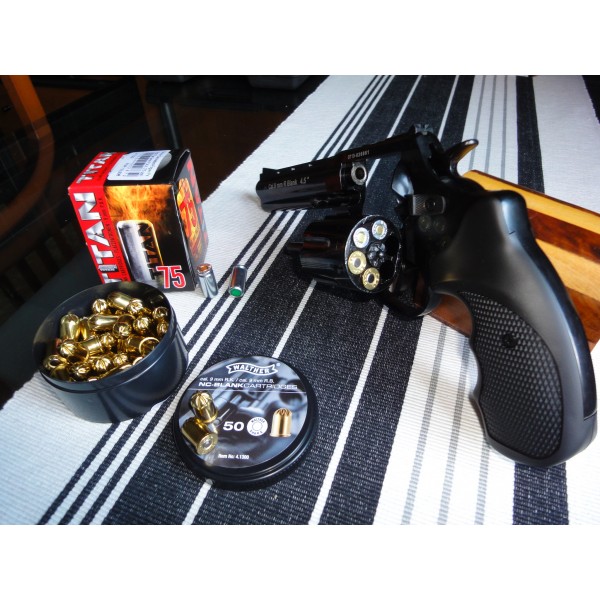 Admite dos tipos de munición, y eso es interesante. Fácil de usar pero tiene para mi una gran pega, se pela la pintura rapidísimamente y eso afea enormemente el revolver, pero bueno se trata de una detonadora muy económica y no se le puede pedir peras al olmo. - Calibre: .380 y 9 mm P.A.K. - Capacidad: 6 tiros - Longitud total: 235 mm. - Peso: 850 gr.