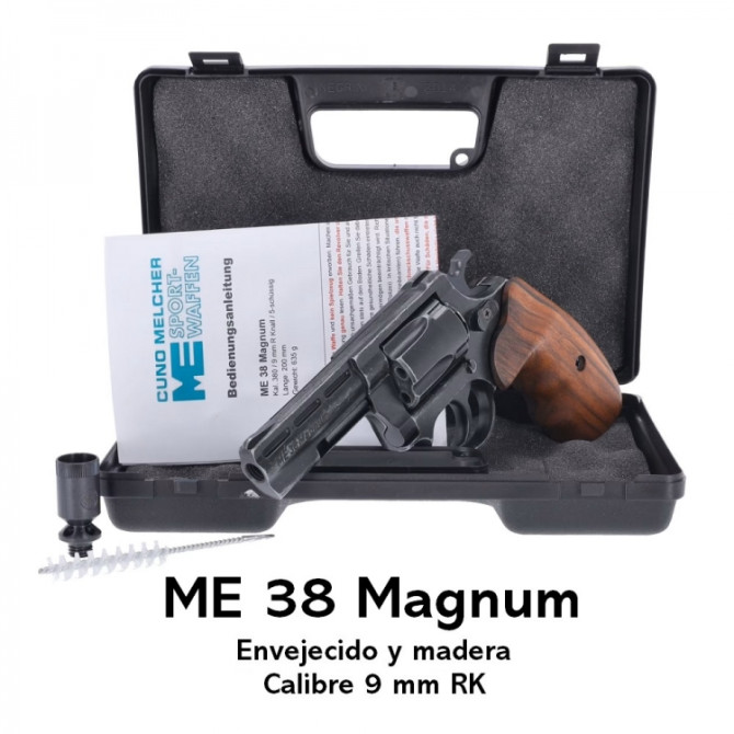 Leopard, armería deportiva con más de 40 años de experiencia, sigue actualizando el catálogo de pistolas y revólveres de fogueo, en este caso es un revólver fabricado por la empresa alemana Cuno Melcher ME, modelo 38 Magnum Envejecido/Madera 380/9 mm. El aspecto es muy realista, con un peso de 635 g y un cañón de 80 mm. Calibre: 380/9 mm.