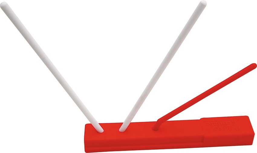 Sharpener Deluxe Sharpening System. 9 3/8” plastic base with removable hand guard. Twin aluminum ceramic sharpening rods. Comes in plastic storage bag.
