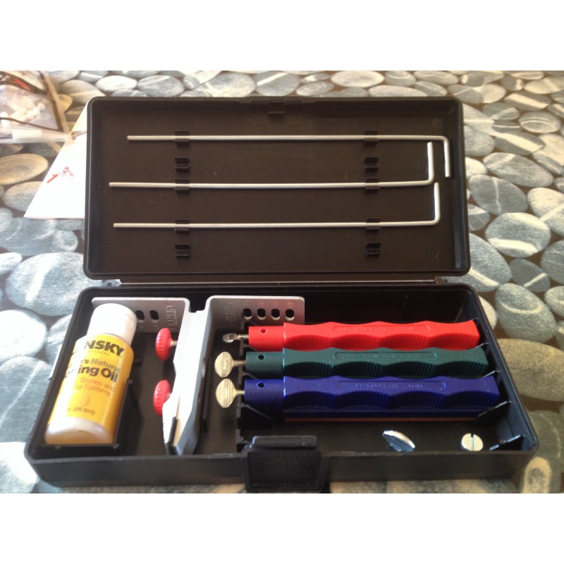 Includes serrated edge sharpening, coarse, medium and fine hones. Each sharpening system comes with precision multi-angle, flip-over knife clamp, sharpening hones on color coded finger grooved safety holders, one guide rod for each stone, specially formulated honing oil and extra long knife clamp screws. Custom molded storage/carrying case. Includes easy to follow instructions.