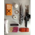 G0700 Kit Supervivencia Gerber Bear Grylls.• Navaja • Bolsa resistente al agua. • Silbato de emergencia. • Fire Starter para hacer fuego. • Cerillas resistentes al agua. • Alambre • Silbato de emergencia. • Bobina de algodón y mecha • Bolsa ligera de nylon con cremallera resistente al agua • Contiene guía básica de supervivencia.