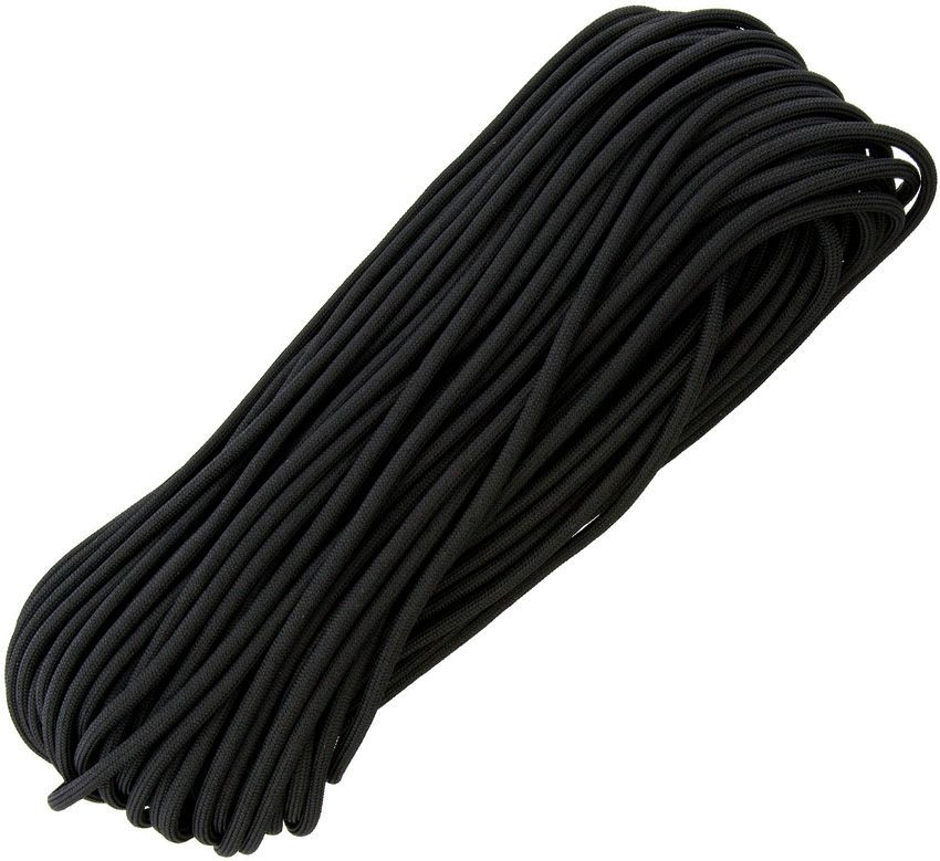 Black. 4mm diameter. Rated for 550lbs. 7 strand. One color-coded tracer strand. MIL-C-5040 Type III is military grade and is used by military, government and law enforcement agencies. Berry compliant. Made in U. S. A. Color may vary due to dye lots. 100ft. Nylon construction. Bulk packed.