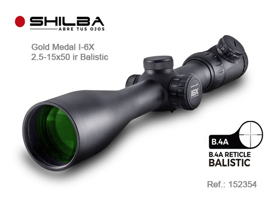 Shilba ha desarrollado el modelo Gold Medal 2,5-15x50 B4A IR, un visor robusto que gracias a su amplio rango de aumentos, de 2,5 a 15, permite apuntar a objetivos situados a diferentes distancias. A su vez cuenta con una salida de 56mm, que ofrece al usuario un campo de visión bastante amplio y una multiplicación x6 con corrector de paralaje lateral.