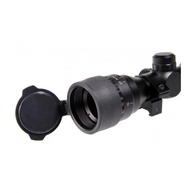 Así mismo, este visor presenta un control de paralaje manual en el objetivo. Además, incorpora un juego de anillas para carril Picatinny, para su adaptación en armas que cuenten con este tipo de raíl. También incluye parasol con rosca para acoplar al objetivo y tapas protectoras.