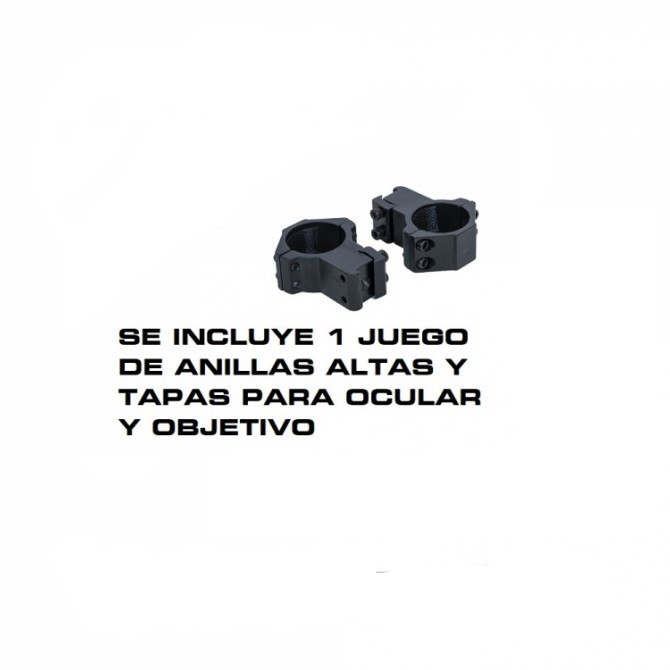 Este dispositivo óptico está equipado con un juego de anillas altas de raíl de 11mm e incorpora tanto tapas para el ocular como para el objetivo. De esta forma, se podrá acoplar perfectamente a cualquier carabina con raíl de 11mm.