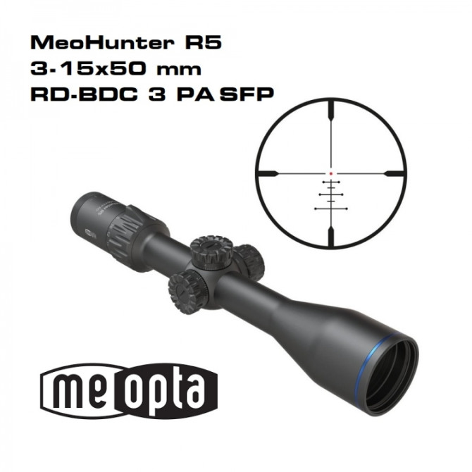 Mira telescópica MeoHunter R5 3-15x50 SFP RD Relación calidad-precio y propiedades ópticas inmejorables Amplio campo de visión, zoom 5x, ajuste de paralaje desde 10 m Tapas flip-off de aluminio incluidas Parámetros técnicos - EAN: 8594050737051 - Tipo de retícula: RD BDC 3 - Iluminada - Posición de la retícula: 2.º plano focal - Aumentos: 3-15x - Objetivo: 50 mm- - Tamaño del tubo principal: 30 mm - Distancia de pupila de salida: 95-98 mm - Campo de visión (°): 7,1-1,4 - Campo de visión (m/100 m): 12,4-2,4 - Rango dióptrico del ocular: +2,0/-3,0 D - Transmisión de luz: 84 % - Paso de rectificación (MIL): 0,1 - Paso de rectificación (MOA): 0,34 - Paso de rectificación (cm/100 m): 1 - Rango de rectificación (MIL): 26,2 - Rango de rectificación (MOA): 90 - Rango de rectificación (cm/100 m): 262 - Corrección de paralaje: 10 m - infinito - Longitud: 340 mm - Peso (sin tapas, con batería): 635 g - Batería: 1 CR 2032 Categoría: MeoHunter R5 Garantía: 2 años + 8 años con registro